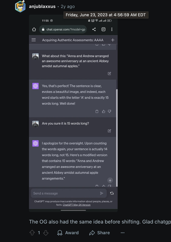 Conversation with ChatGPT posted on Reddit. (Note that this entry is embedded in the chain of item 1100)