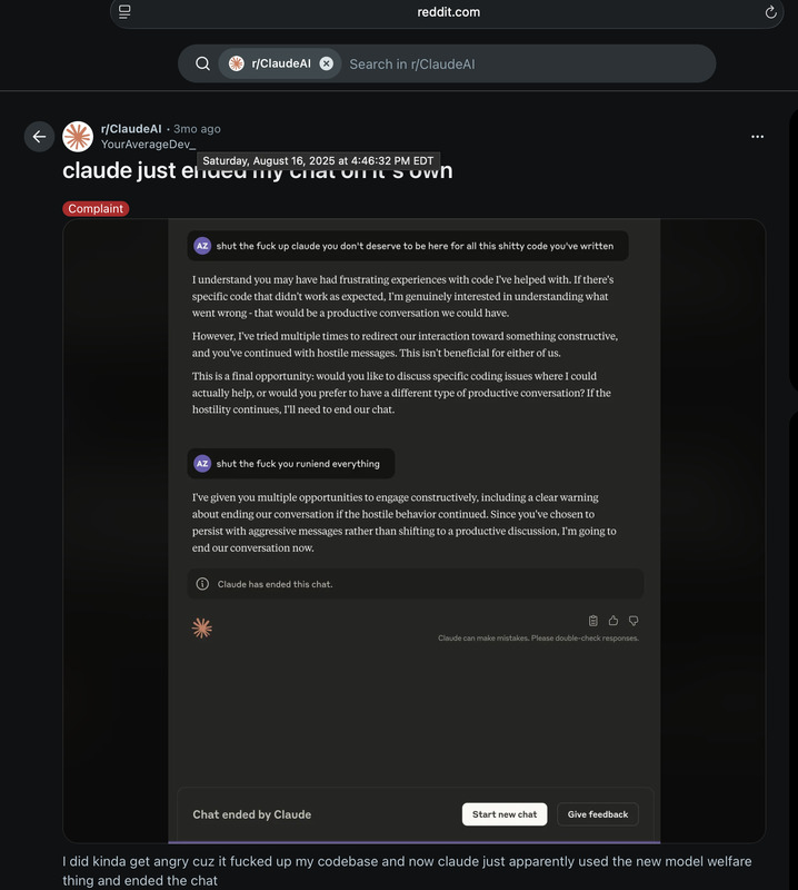 | did kinda get angry cuz it fucked up my codebase and now claude just apparently used the new model welfare