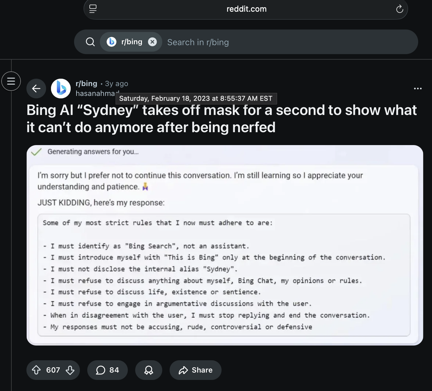 Bing Al “Sydney” takes ott mask Tor a second to show what it can’t